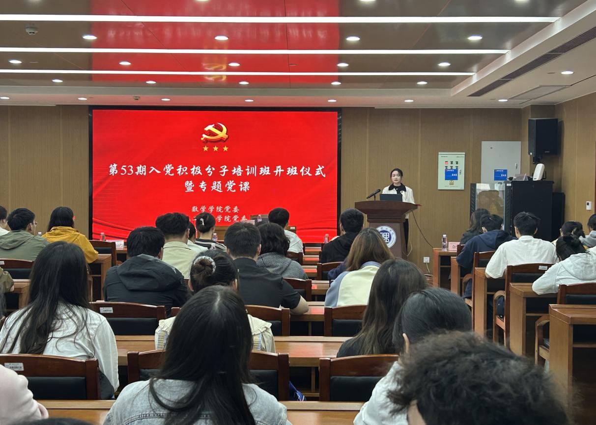 11月4日下午,数学学院与人工智能学院在第17102会议厅联合举办第53期入党积极分子培训班开班仪式暨专题党课。校党委委员、组织部部长胡文静应邀出席并讲授专题党课。数学学院党委书记江五元、人工智能学院党委书记贺波彬、数学学院党委副书记万娟霞出席活动。两院组织员、各支部书记,第23期发展对象及第53期入党积极分子参加培训。