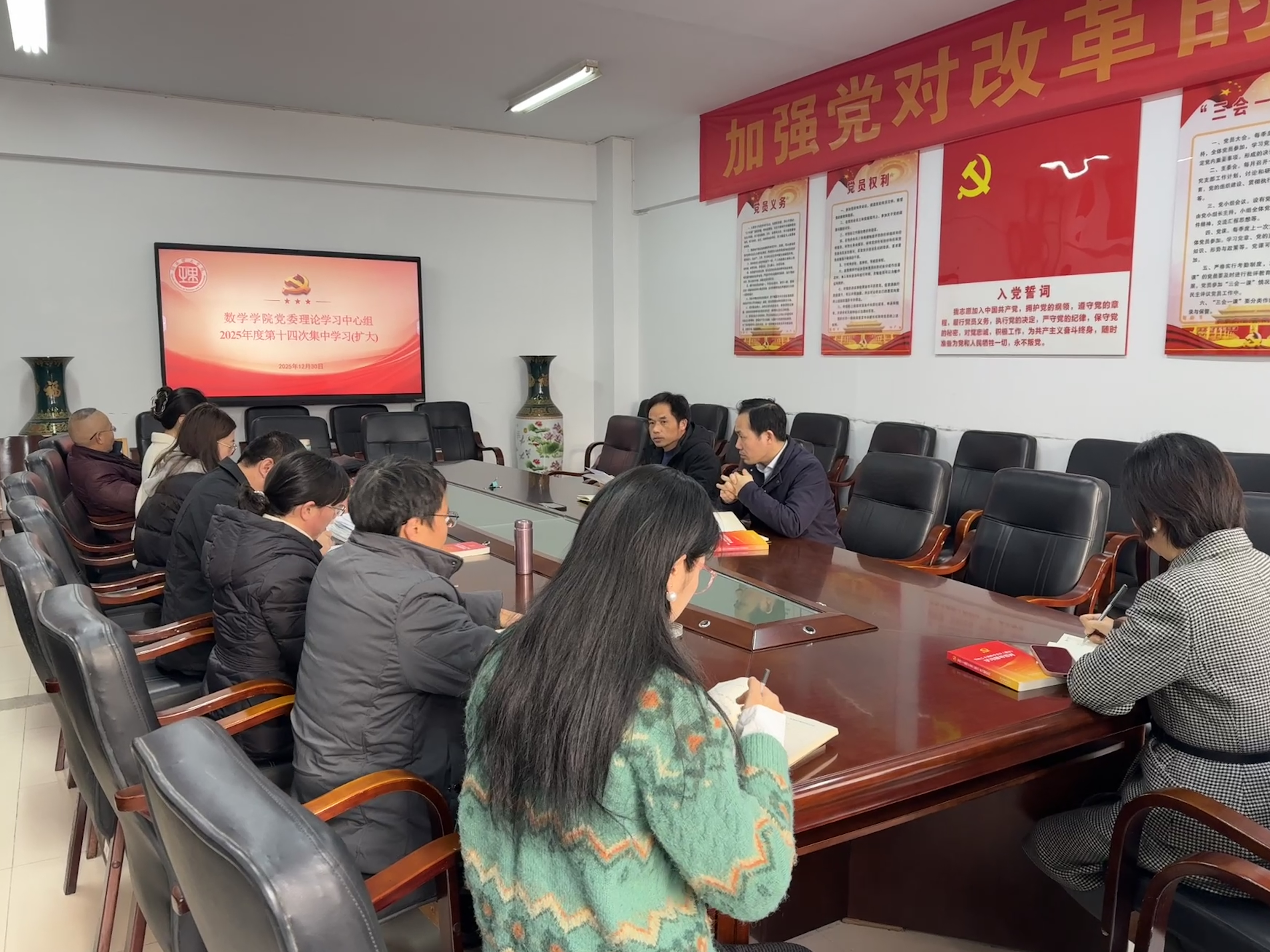 12月30日,数学学院理论学习中心组于5306会议室召开理论学习中心组第十四次集中学习(扩大),深入学习贯彻党的二十届四中全会精神。会议由学院党委书记江五元主持,学院全体领导班子、各党支部书记参加学习。